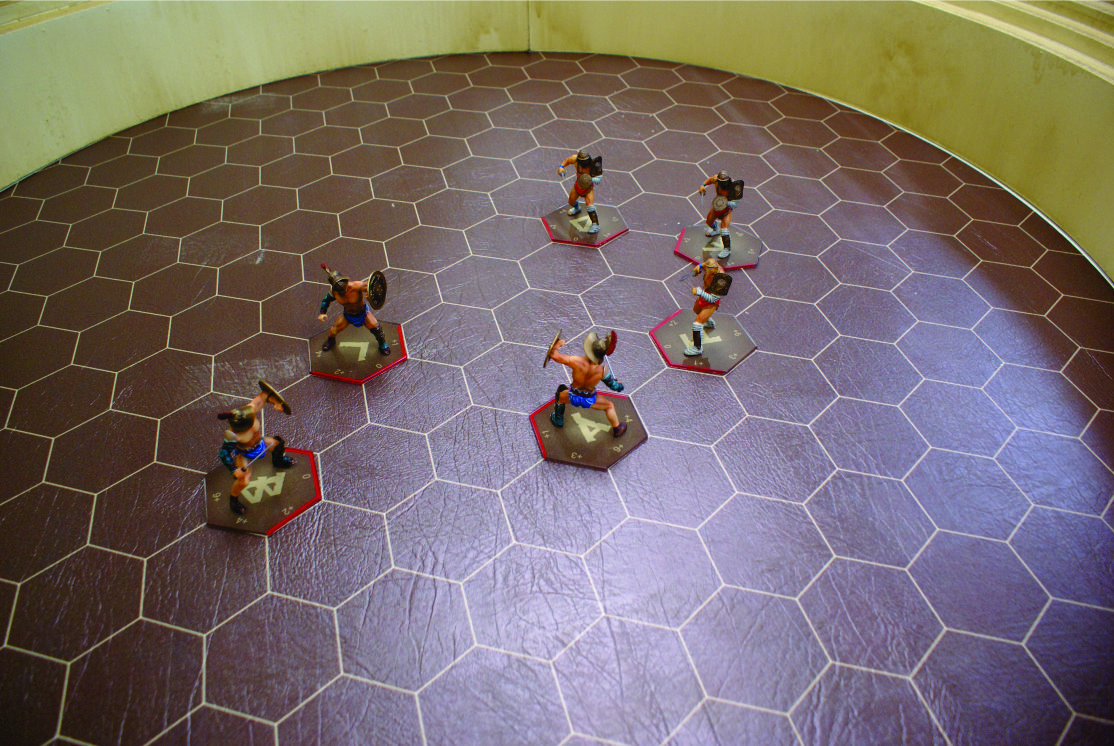 ReplyDeleteWe're using the Battleline/Avalon Hill Gladiator game rules. We've looked at some other rules, but anything less full-featured than the basic rules of that game just don't do justice to the battlefield. The 90mm scale figures are BBI Gladiator figures glued to a custom hex base made by our own Rick Ivansek, who is also responsible for the construction of this Coliseum and its companion 22'x7' Hippodrome.
